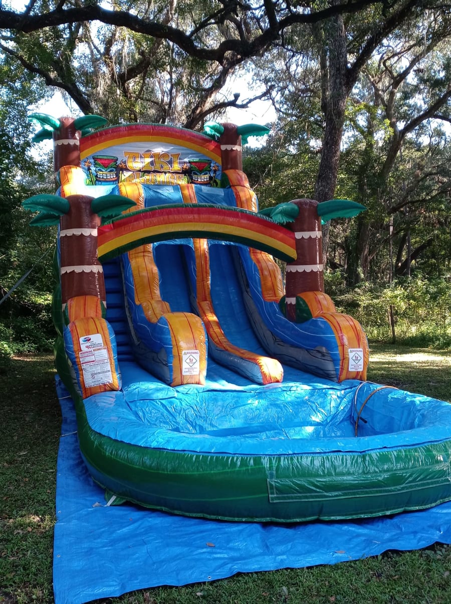 Make your next party an unforgettable adventure with our water slide rentals 18ft Tiki Plunge Double Lane Deep Pool in Brooksville, Spring Hill. This vibrant and eye-catching inflatable slide brings the spirit of a tropical paradise right to your backyard, featuring lush palm trees, bright colors, and an exhilarating double lane design. Whether you’re hosting a birthday bash, family reunion, or community event, this water slide is sure to be the center of attention!